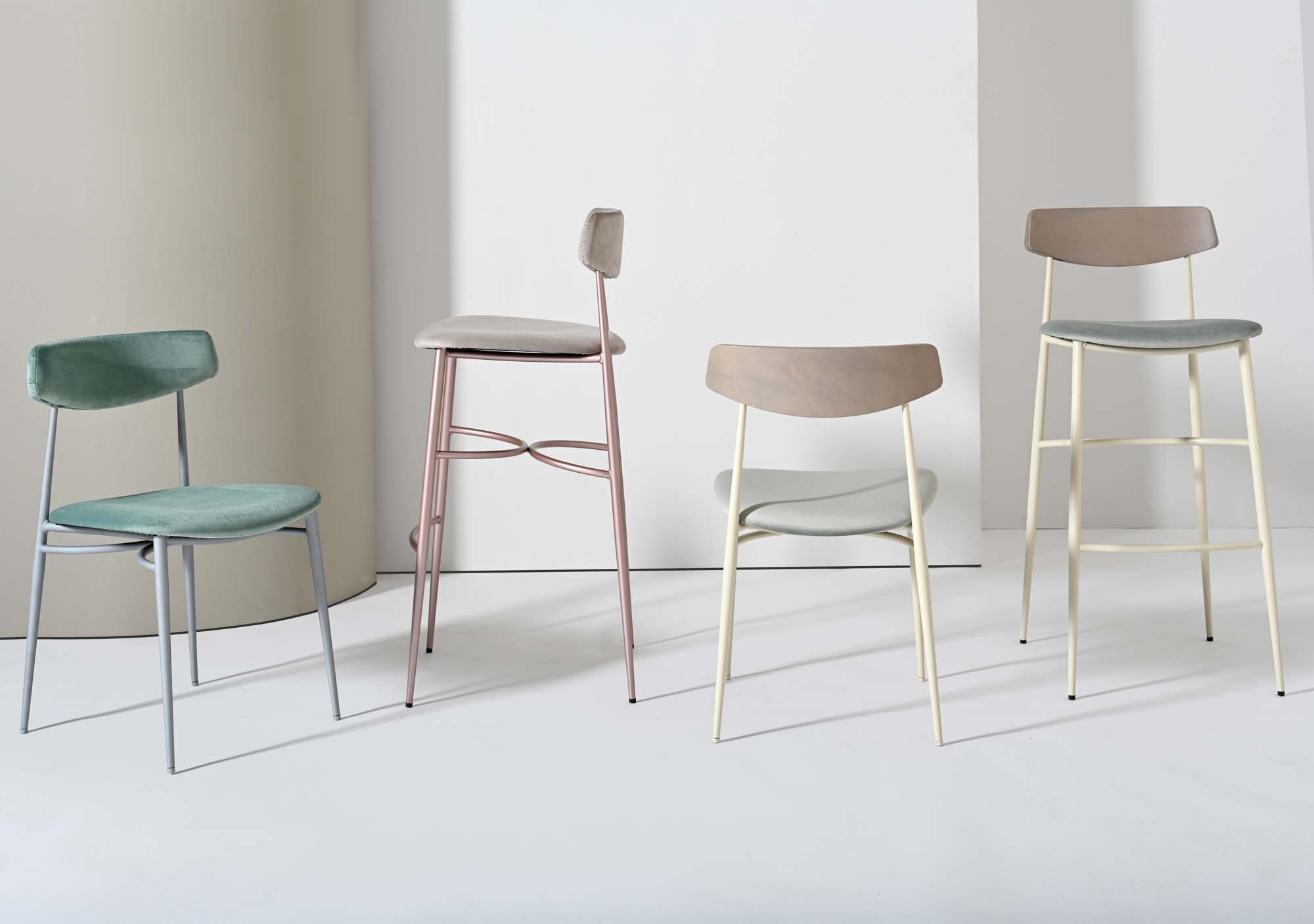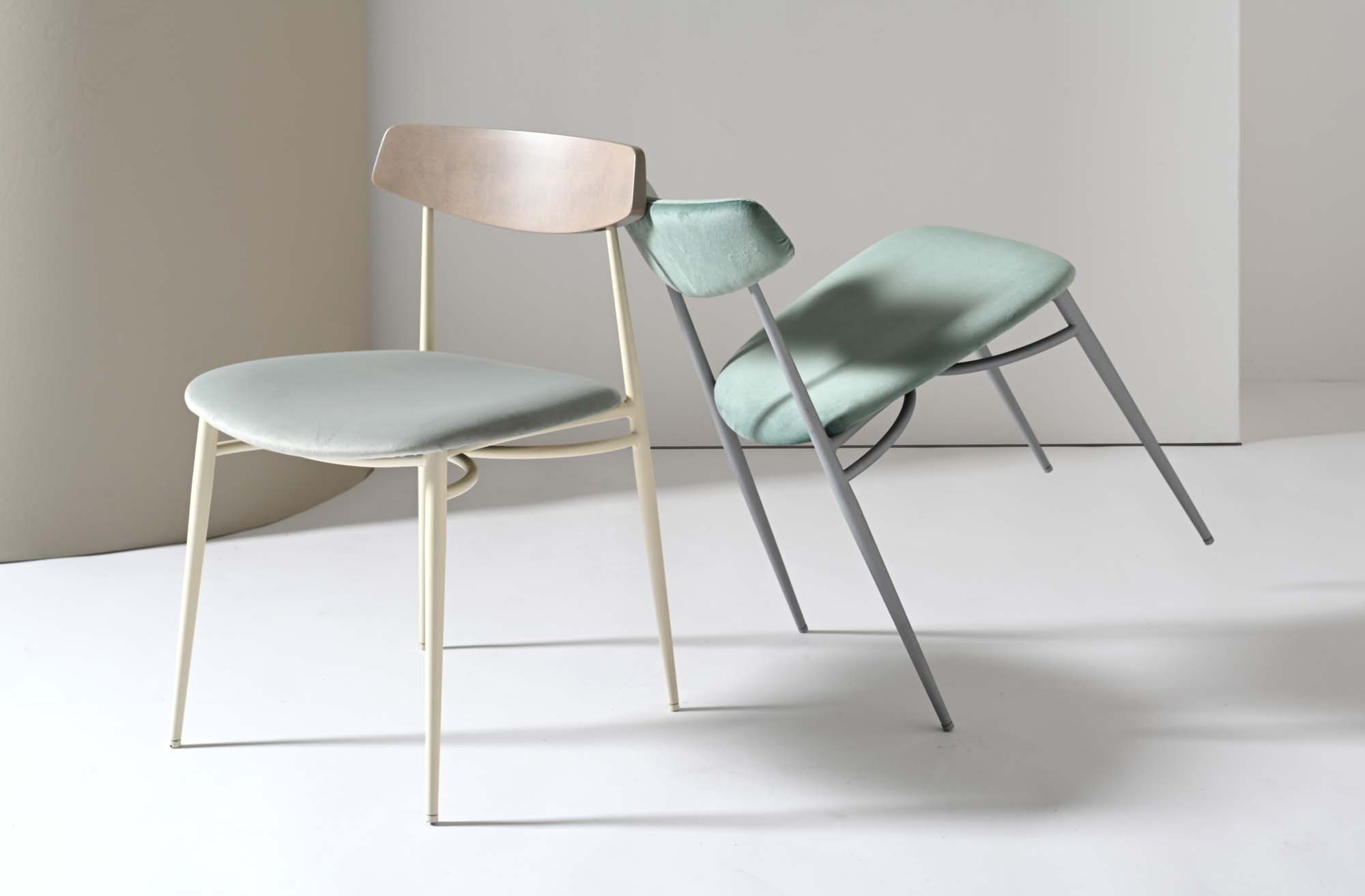 Minimal lines and a strong look give the Asia collection a large flexibility in use. An agile metal frame supports a comfortable seat with an essential design and a back in solid beech wood, available in different variants.