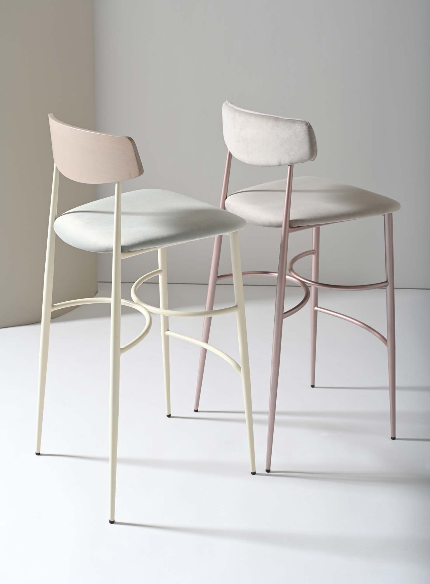 Two arches are mirrored like two opposite half-moons. Placed halfway up the legs, they reinforce the slender structure of the Asia stool by supporting a comfortable and wide upholstered seat.