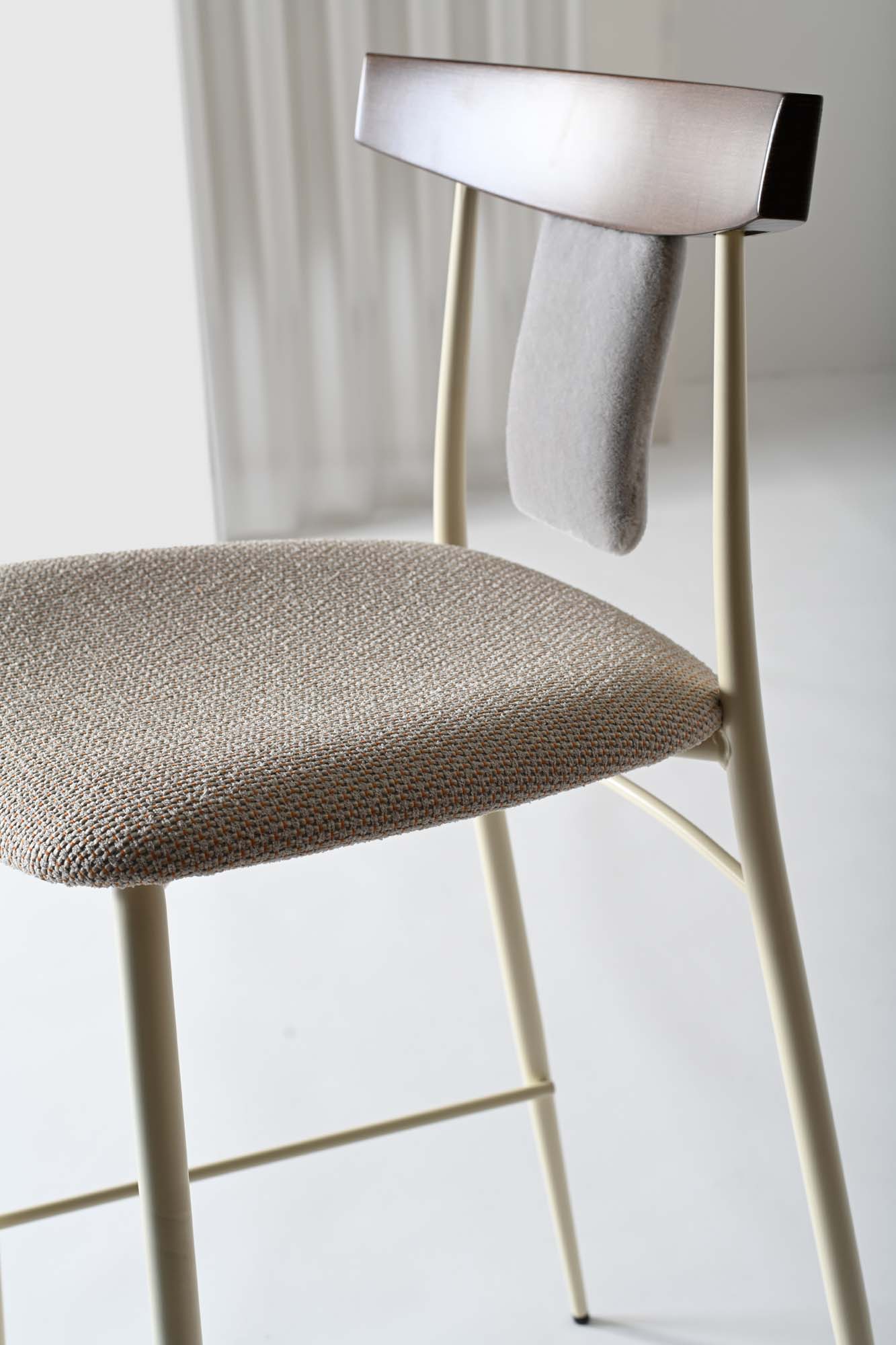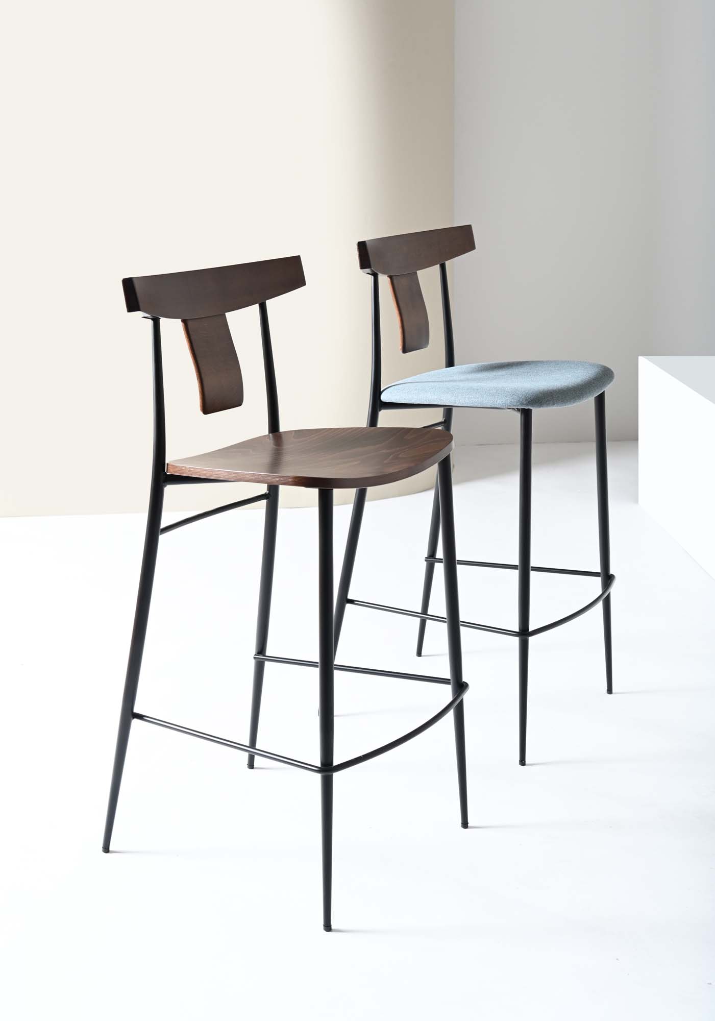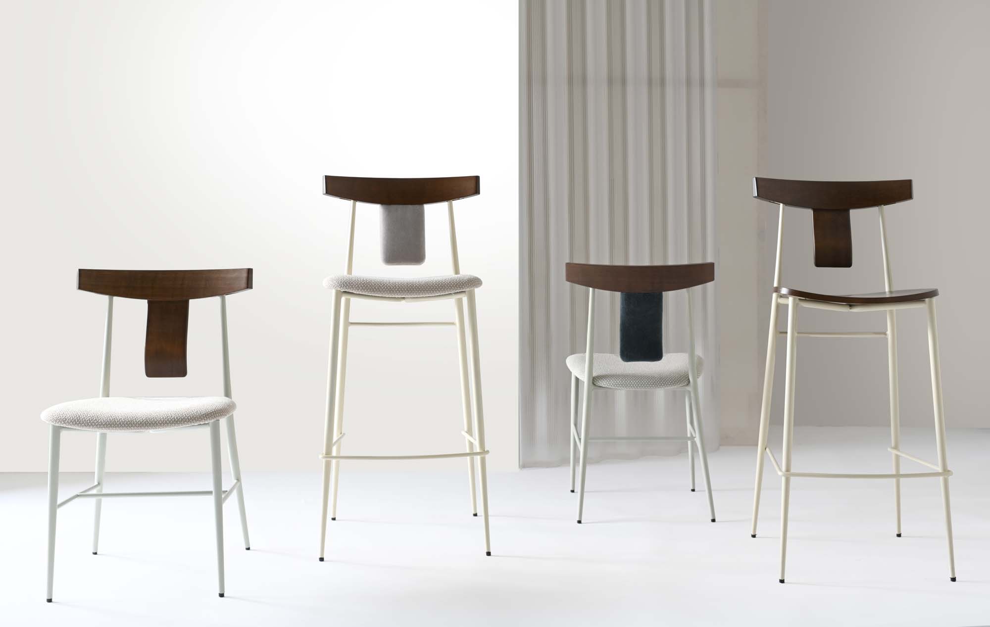 CHAIR | STOOL Beech plywood seat and solid beech wood backrest. Seat available in different versions Polyurethane fire-resistant foam Metal frame Plastic glides The following options are available: -upholstery customization through application of buttons, studs or stitching -contrasting color on the frame feet -stool in bar stool and counter stool versions -supply of the raw item (unpainted and unupholstered) -KD packaging