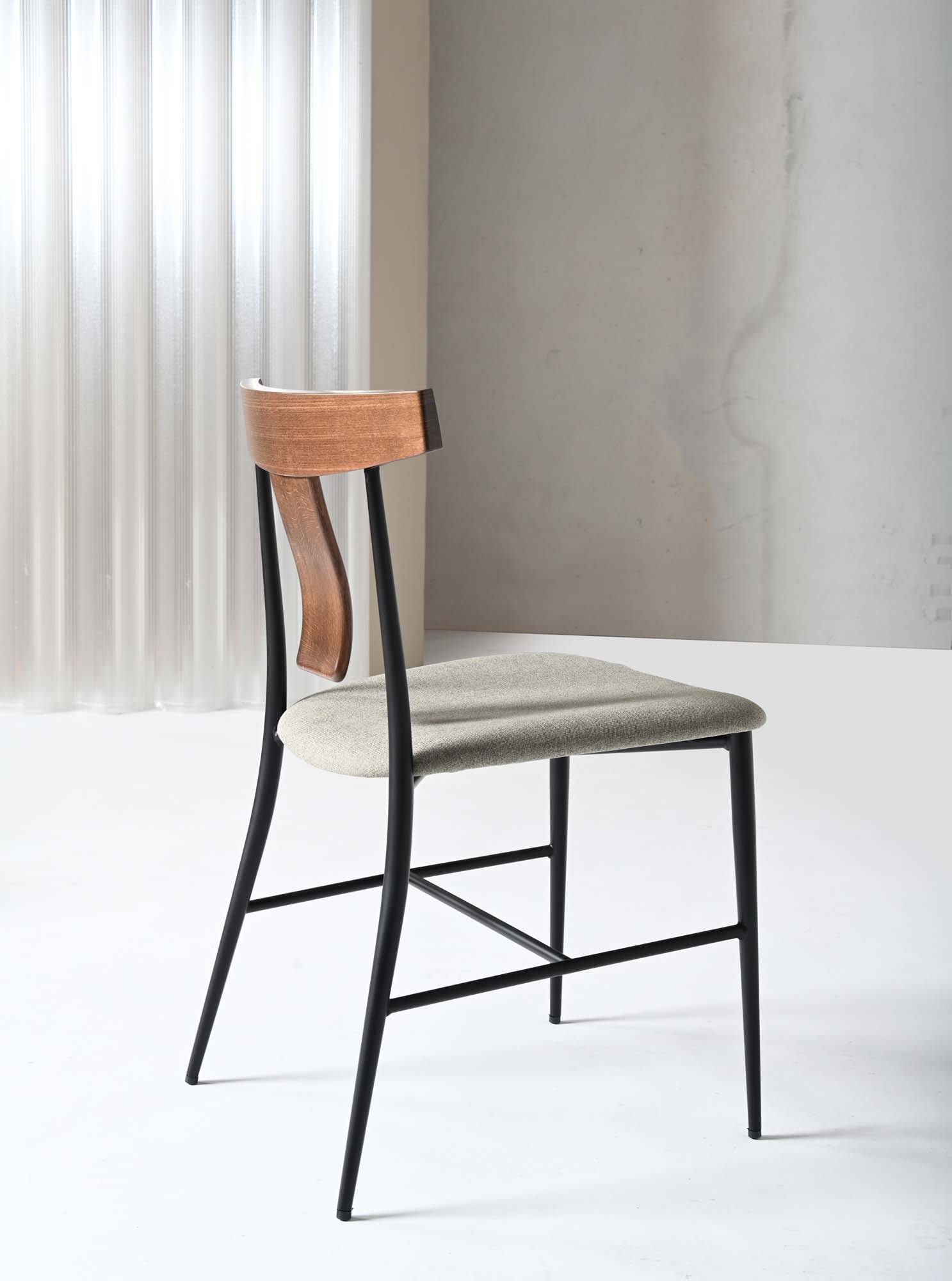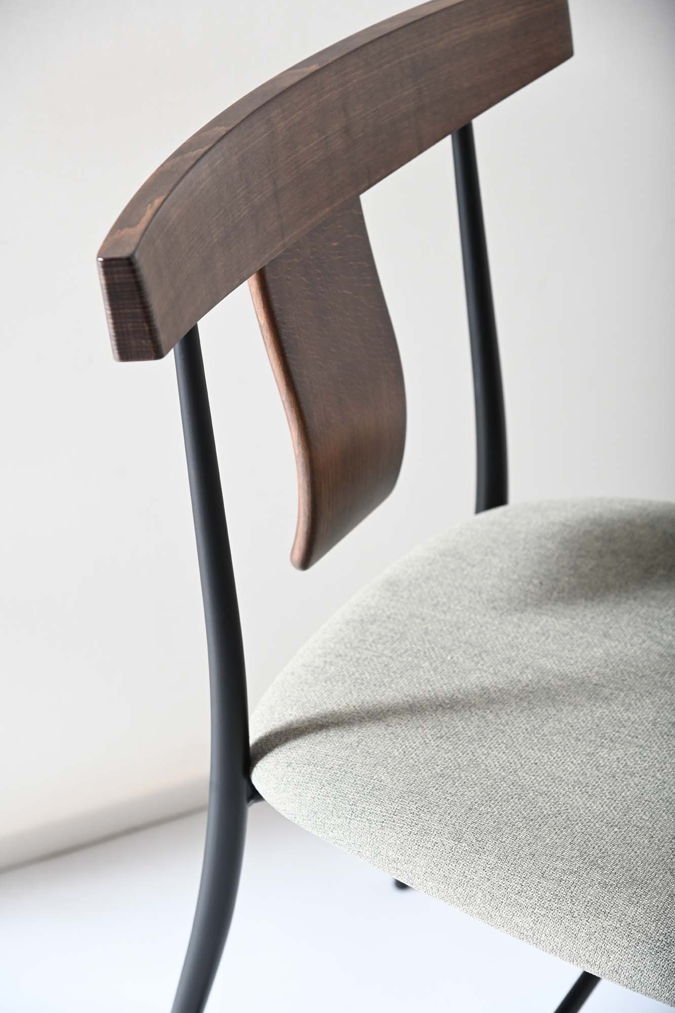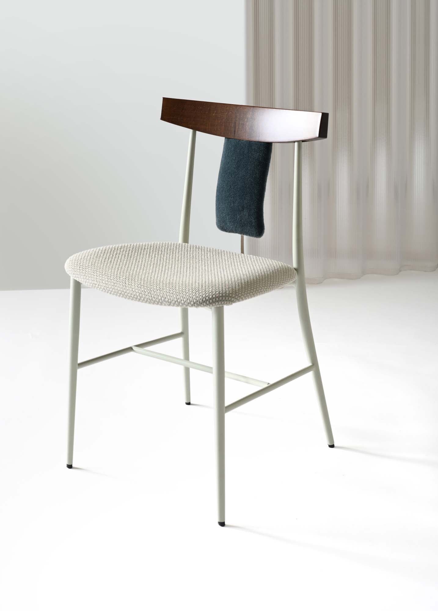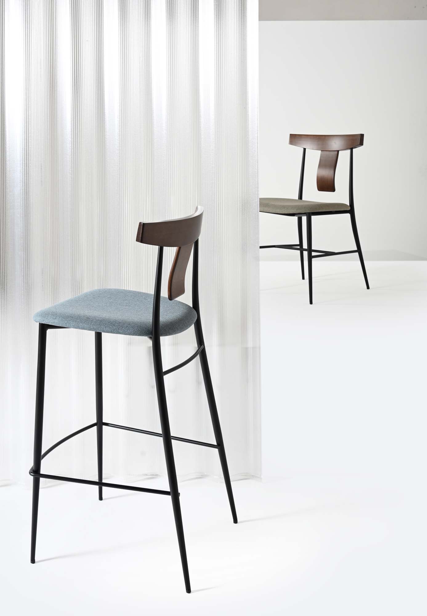 CHAIR | STOOL Beech plywood seat and solid beech wood backrest. Seat available in different versions Polyurethane fire-resistant foam Metal frame Plastic glides The following options are available: -upholstery customization through application of buttons, studs or stitching -contrasting color on the frame feet -stool in bar stool and counter stool versions -supply of the raw item (unpainted and unupholstered) -KD packaging